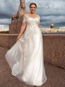 To begin with, the A-line silhouette offers a timeless and flattering choice for plus size women. Papilio Boutique’s Adele Collection features a range of A-line dresses that beautifully enhance curves while providing comfort and elegance. These dresses are designed with cinched waistlines and flowing skirts, creating a stunning hourglass shape. Delicate lace overlays, illusion necklines, and intricate beadwork add a touch of romance and sophistication to these enchanting designs.