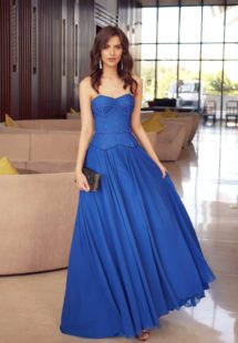 Formal evening gown with sleeves and structured bodice | Color: azure, black, crimson, ivory