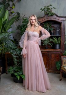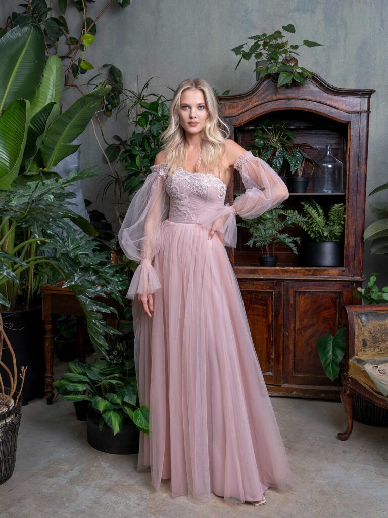 Tulle A-line evening dress with asymmetrical neckline and long bishop sleeves | Color: powder, pink, cherry, grey-blue