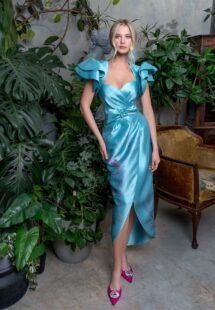 Satin A-line cocktail dress with balloon sleeves | Color: grey-blue, lilac, sea green, azalea