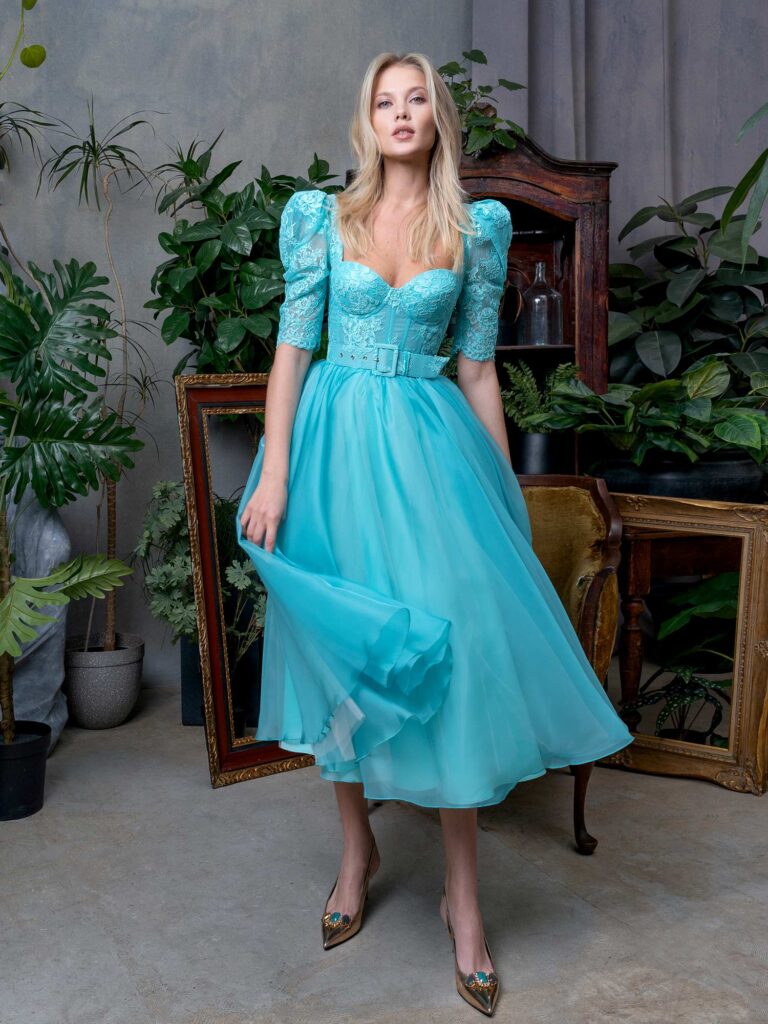 Puff sleeve cocktail dress with lace bodice and organza A-line skirt | comes in midi or maxi length | Color: mint, cream