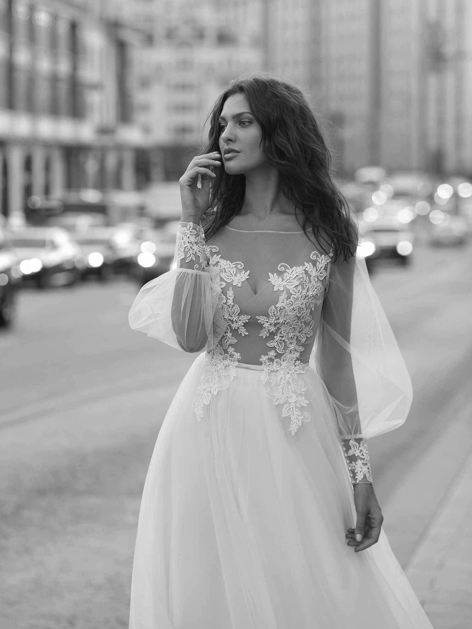 Bishop sleeve A-line wedding dress with illusion neckline and lace detailing on the bodice | available in ivory or ivory-nude