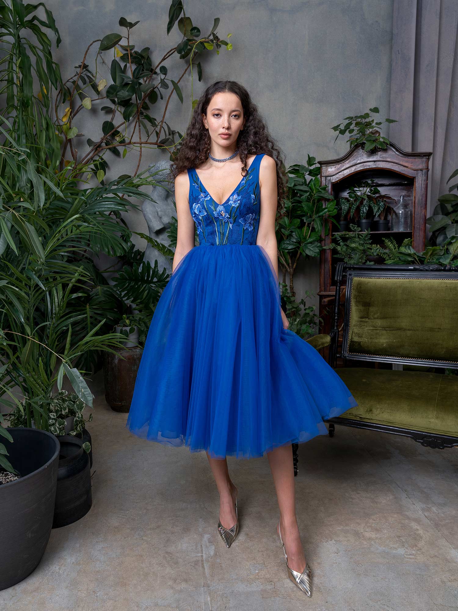 Spaghetti strap tea-length ball gown with a floral bodice and tulle skirt | comes in midi or maxi length | Color: powder, watermelon, black, purple, cherry, azure, pink, grey-blue, light-pink, ivory