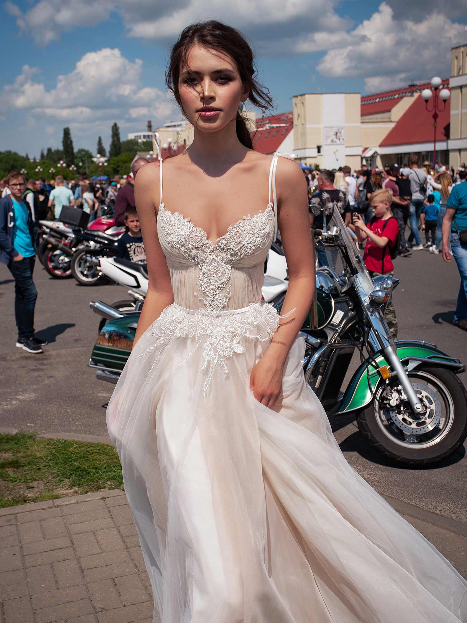 A-line wedding dress with spaghetti straps and embroidered lace, available in ivory, ivory-nude
