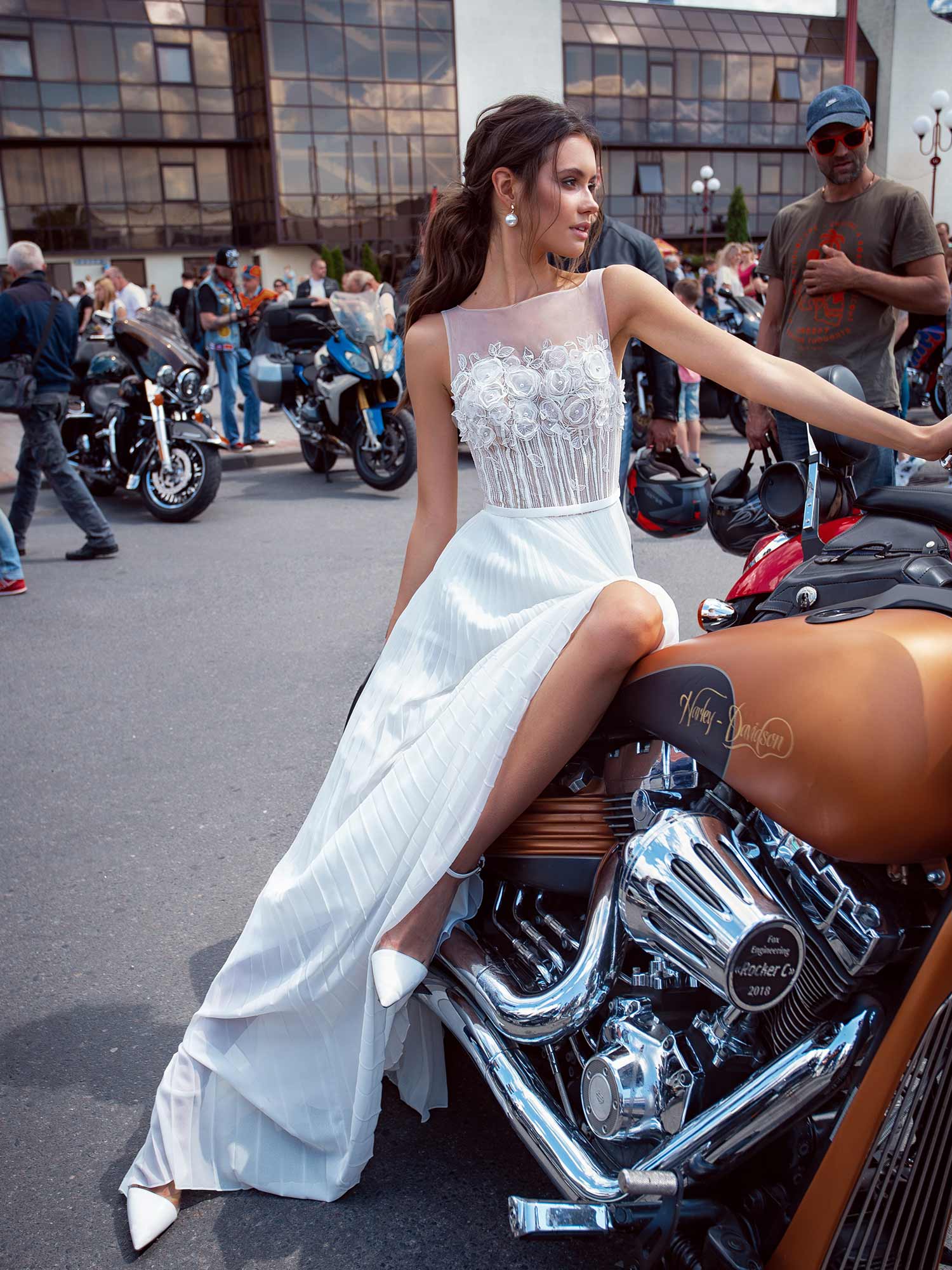 Simple wedding dress with floral applique and pleated skirt, available in ivory, ivory-nude