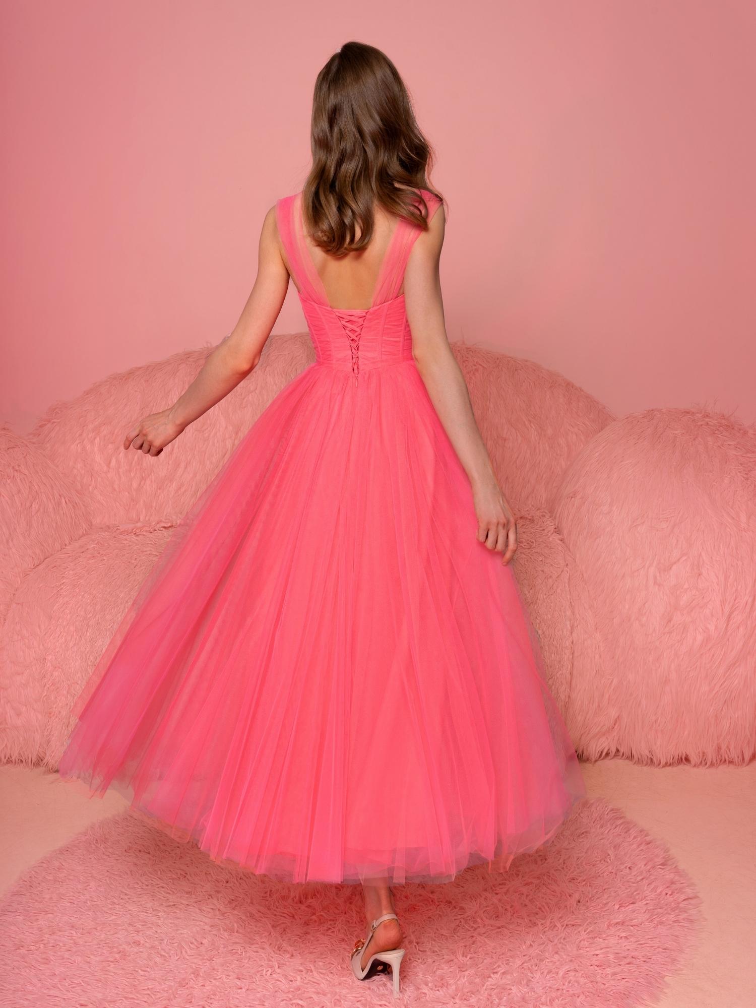 Tulle A-line dress with a bustier-style bodice and tulle straps | comes in midi or floor length | Color: watermelon (shown online), light green, purple, ivory, pink, black, cherry, grey-blue, azure, powder