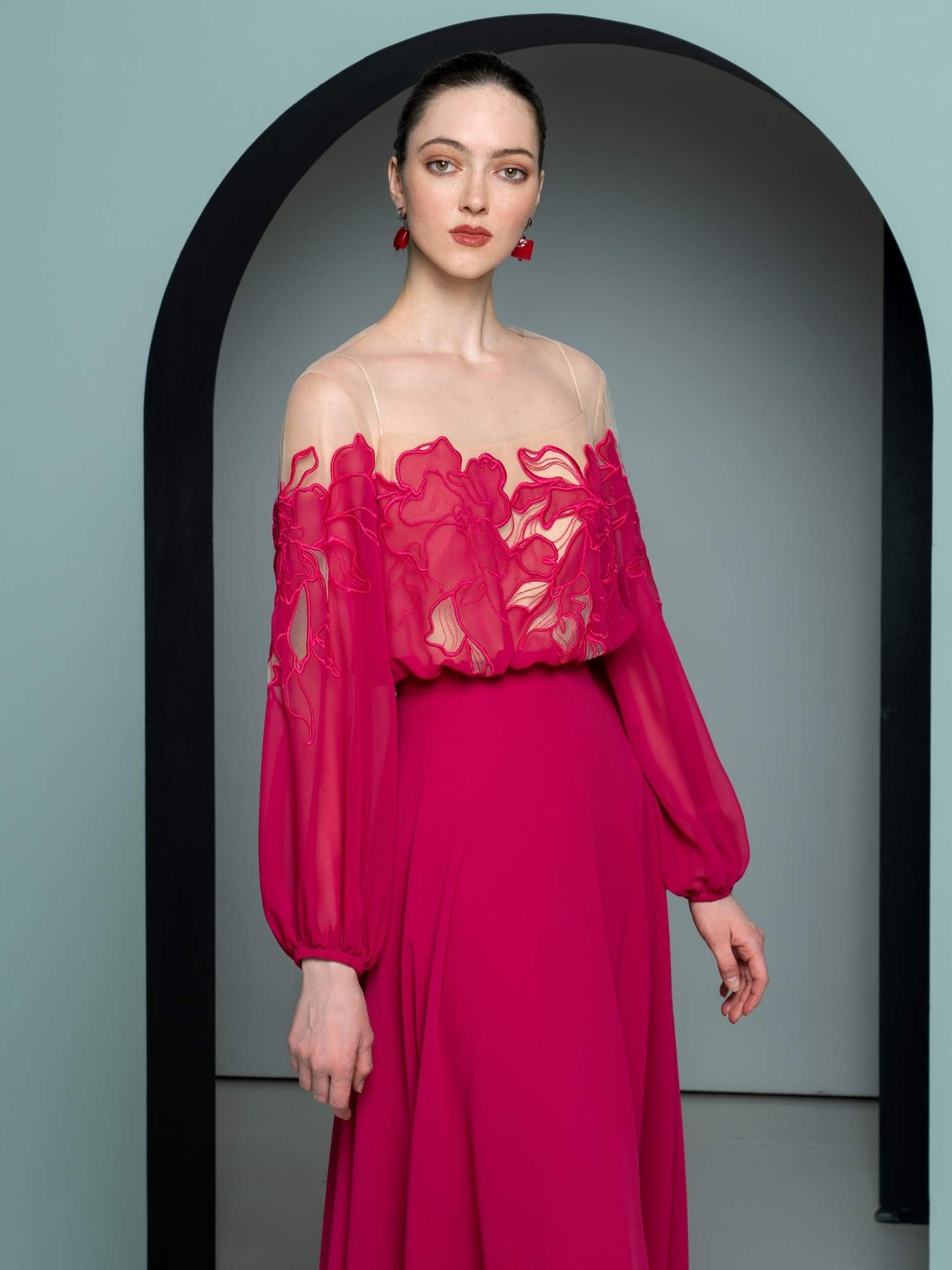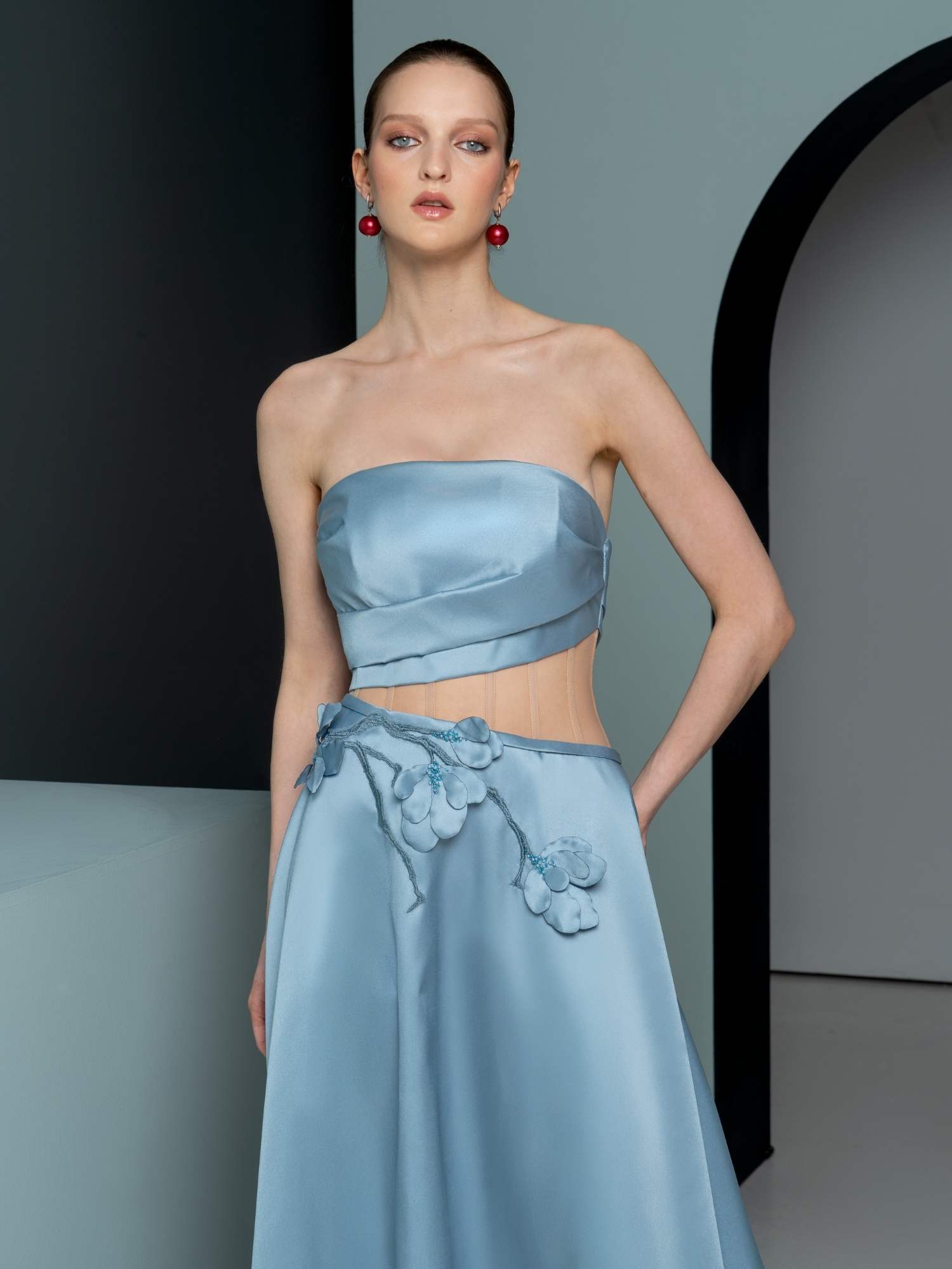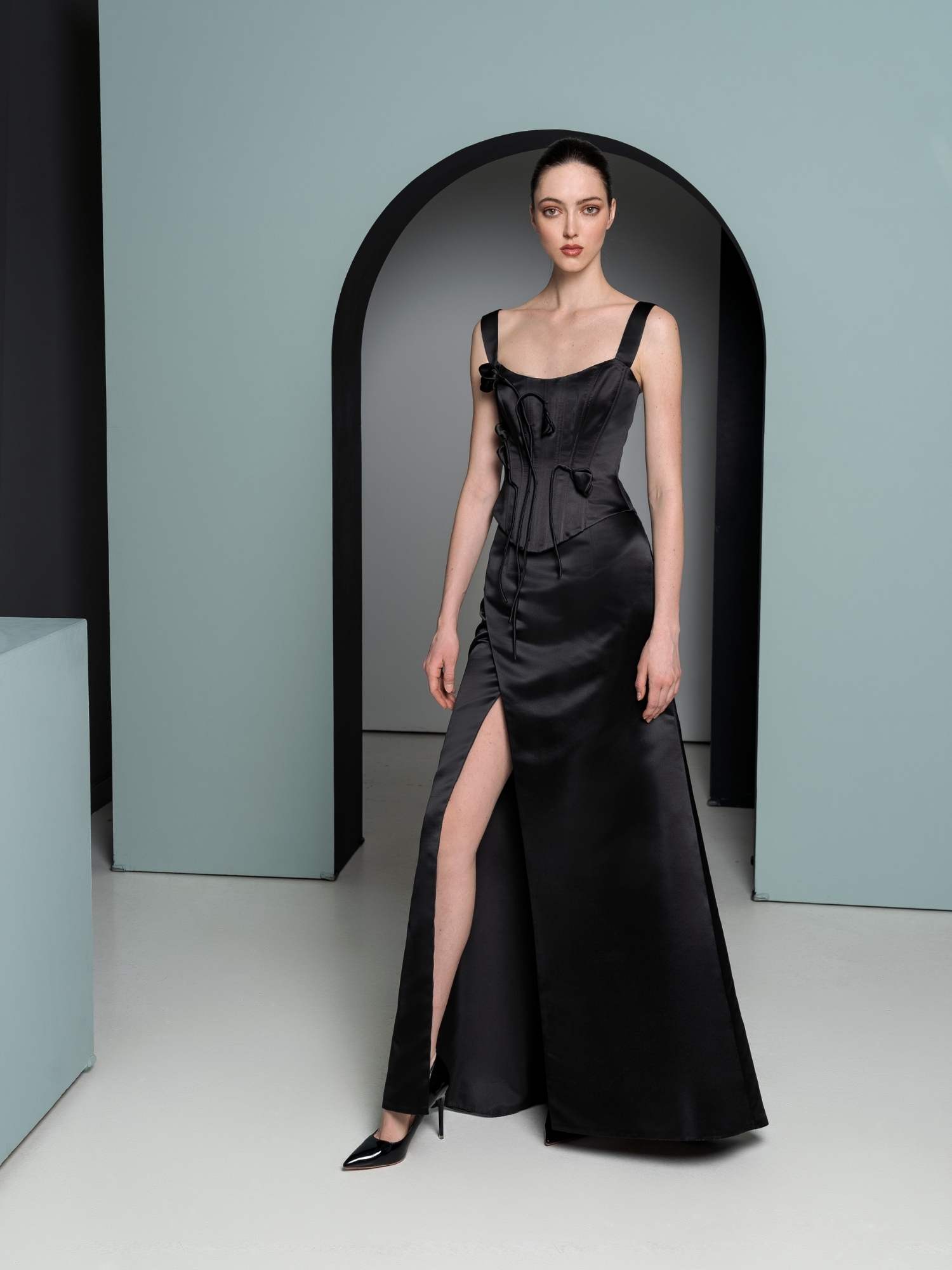 Corsetry is reimagined in this collection, offering versatile and stylish options that pair effortlessly with skirts and trousers. The use of corsets in this modern context not only adds drama but also ensures adaptability, making these formal dresses both fashionable and functional. Alongside, the collection showcases luxurious fabrics such as flowing chiffon, delicate tulle, shimmering crepes, and rich mikado. These materials enhance the beauty of the dresses, while the vibrant color palette, floral accents, and bespoke embroidery elevate their artistry.