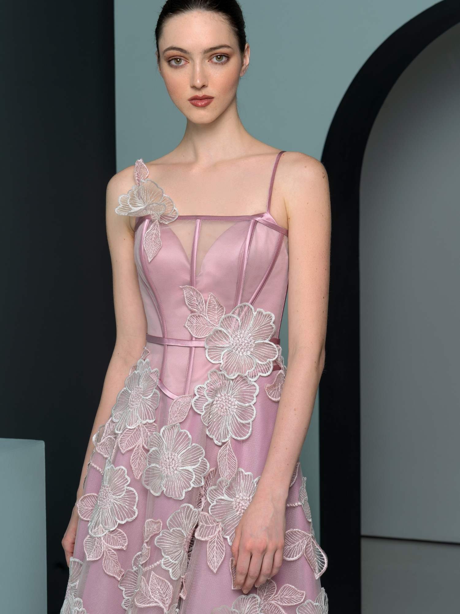 A-Line evening dress with 3D floral applique | Color: pink, ivory | comes in midi or maxi length