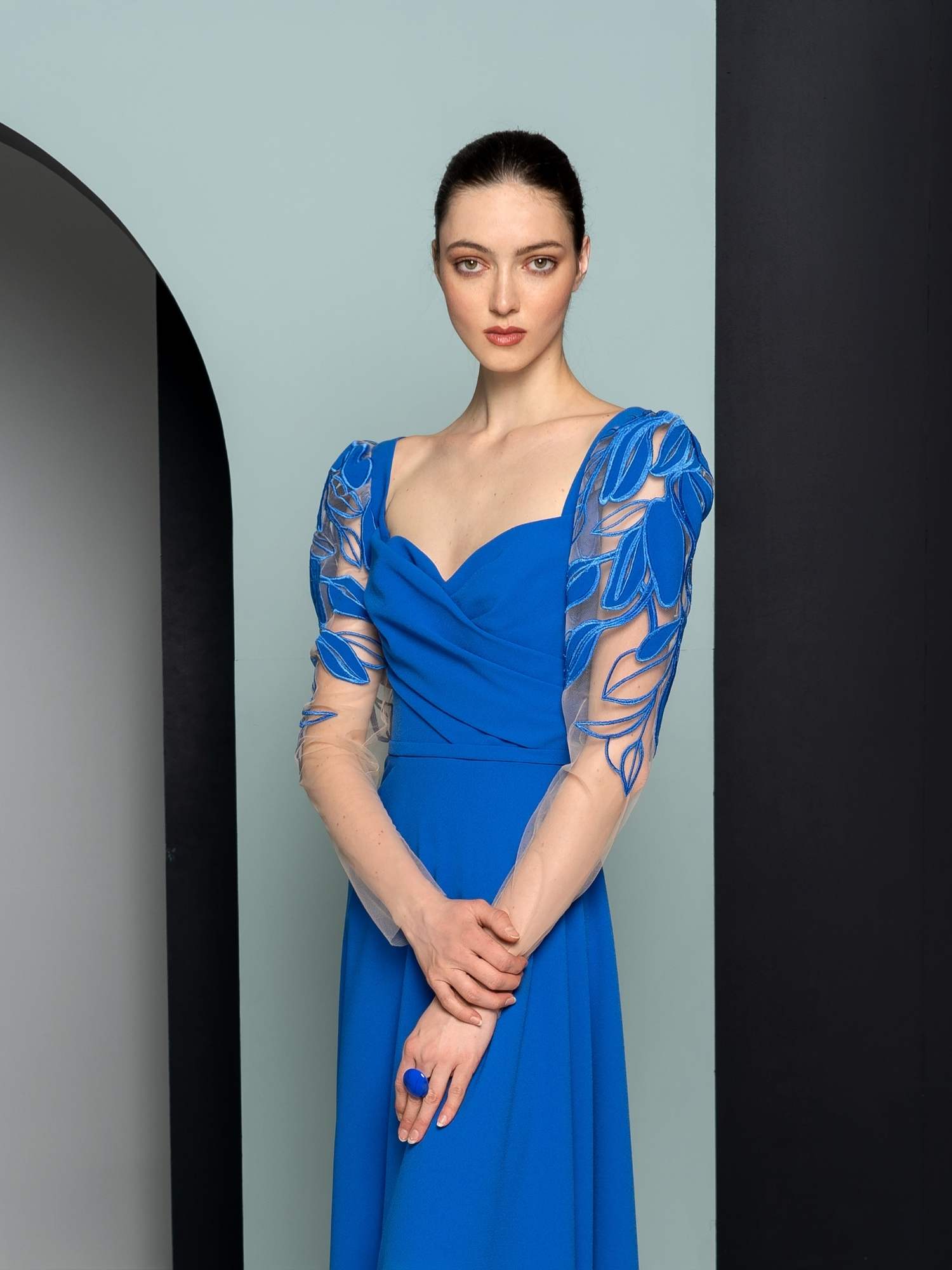 Formal gown with floral sleeve detail | Color: cornflower, fuchsia, black | comes in midi or maxi length